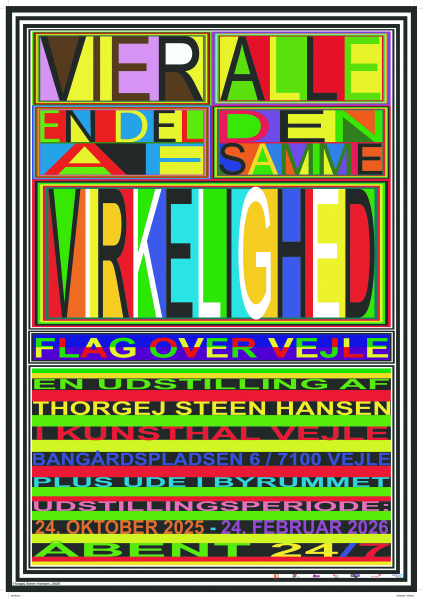 VI ER ALLE EN DEL AF DEN SAMME VIRKELIGHED - Flag over Vejle En separatudstilling i Kunsthal Vejle af billedkunstner Thorgej Steen Hansen. Udstillingsperiode: 24. oktober 2025 - 24. februar 2026. Kan ses hele døgnet.