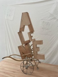 Jeg har bygget en vogn til udstillingen. En vogn hvor stablede bogstaver danner ordet ALENE. På et ’livets bagtæppe’ hænger sommerfugle i flimrende flugt rundt om vognen. De er symbolet på alt det livet er og kan tilbyde.
